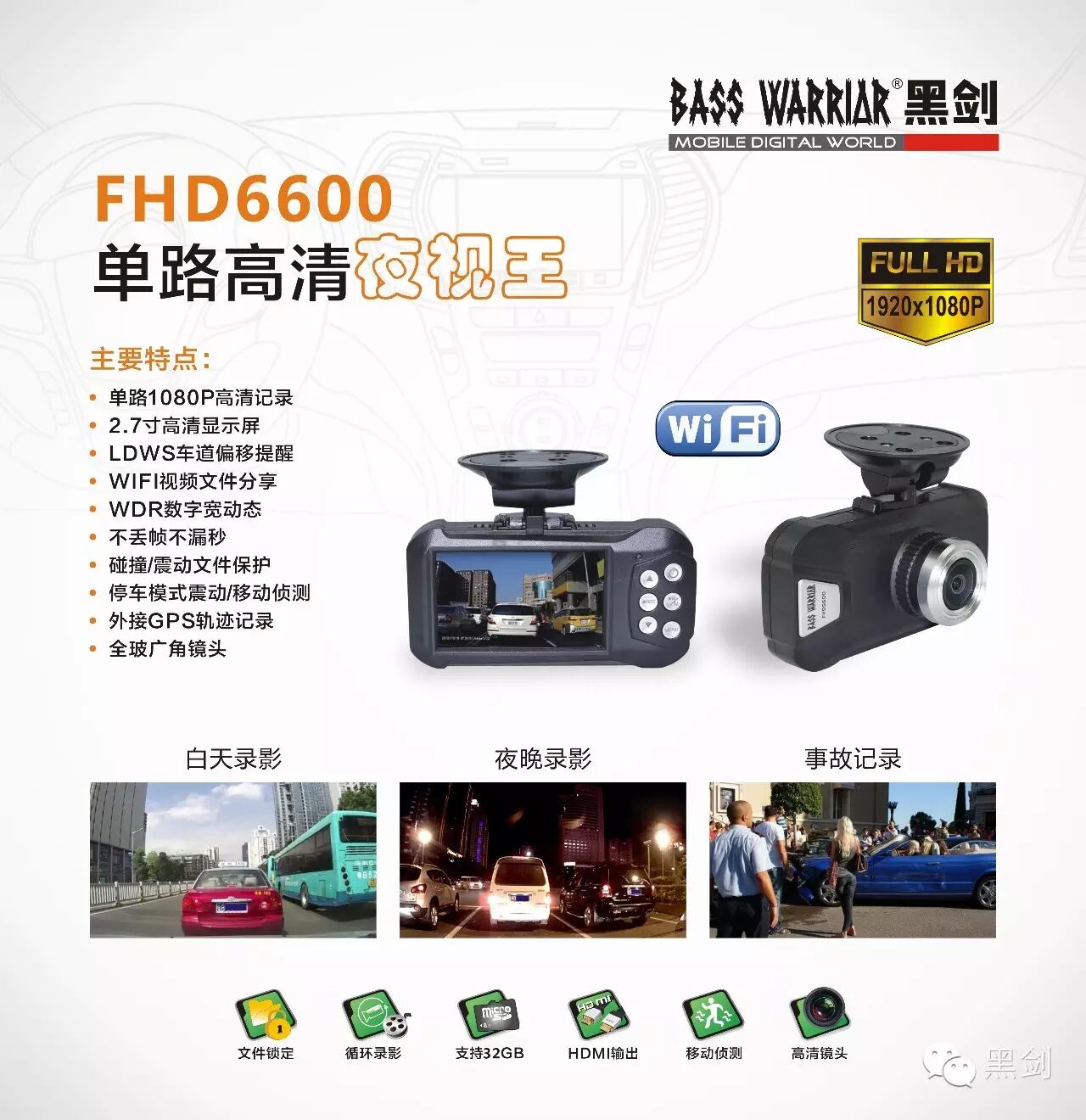 FHD6600在原来FHD5600的基础上升级了夜视效果,新增加了WIFI手机APP功能,支持苹果iOS系统与安卓系统手机,只要下载APP软件,与手机WIFI连接后,即可以在手机上对记录仪进行功能设置、视频文件传输等功能操作,尽享人性化体验。
