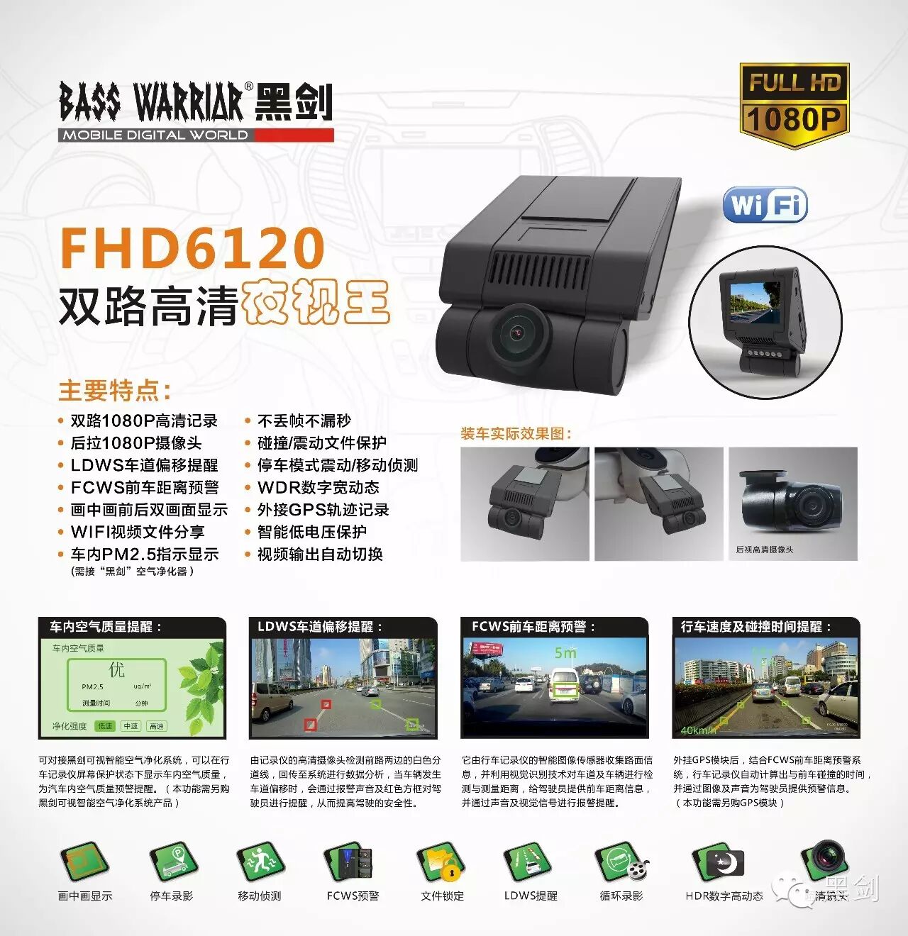 FHD6120为前后双路1080P高清行车记录仪,除了采用了领先的高端视频处理方案外,通过运用LVDS高清视频传输技术,使后拉摄像头1080P高清图像远距离传输成为现实,同时还拥有车道偏离提醒预警(LDWS)、前车距离预警(FCWS)、WIFI智能APP控制功能。