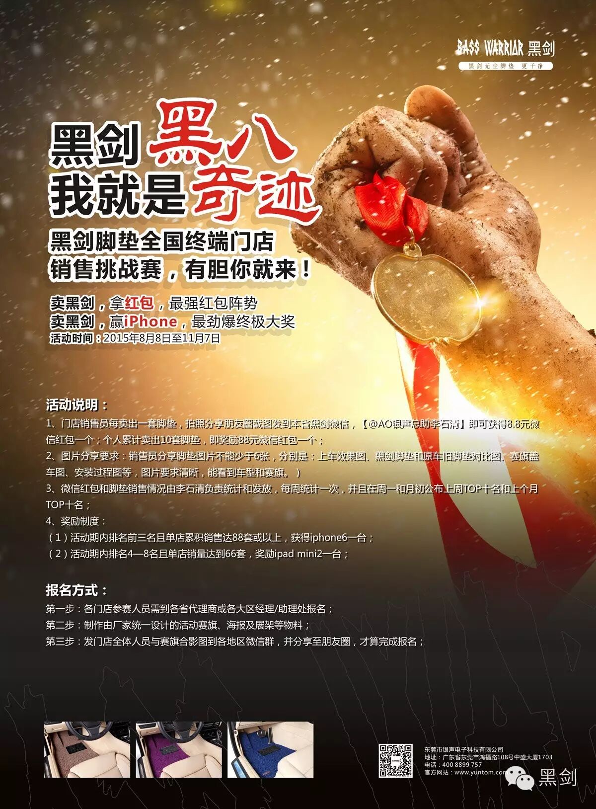 从8月8日至11月7日,每卖出一套黑剑脚垫就能拿红包8.8元红包一个;累计满10套再拿88元大红包一个;活动前3名的门店还有高大上的iphone6哦 (满88套);活动前4-8名送ipad mini2(满66套)。